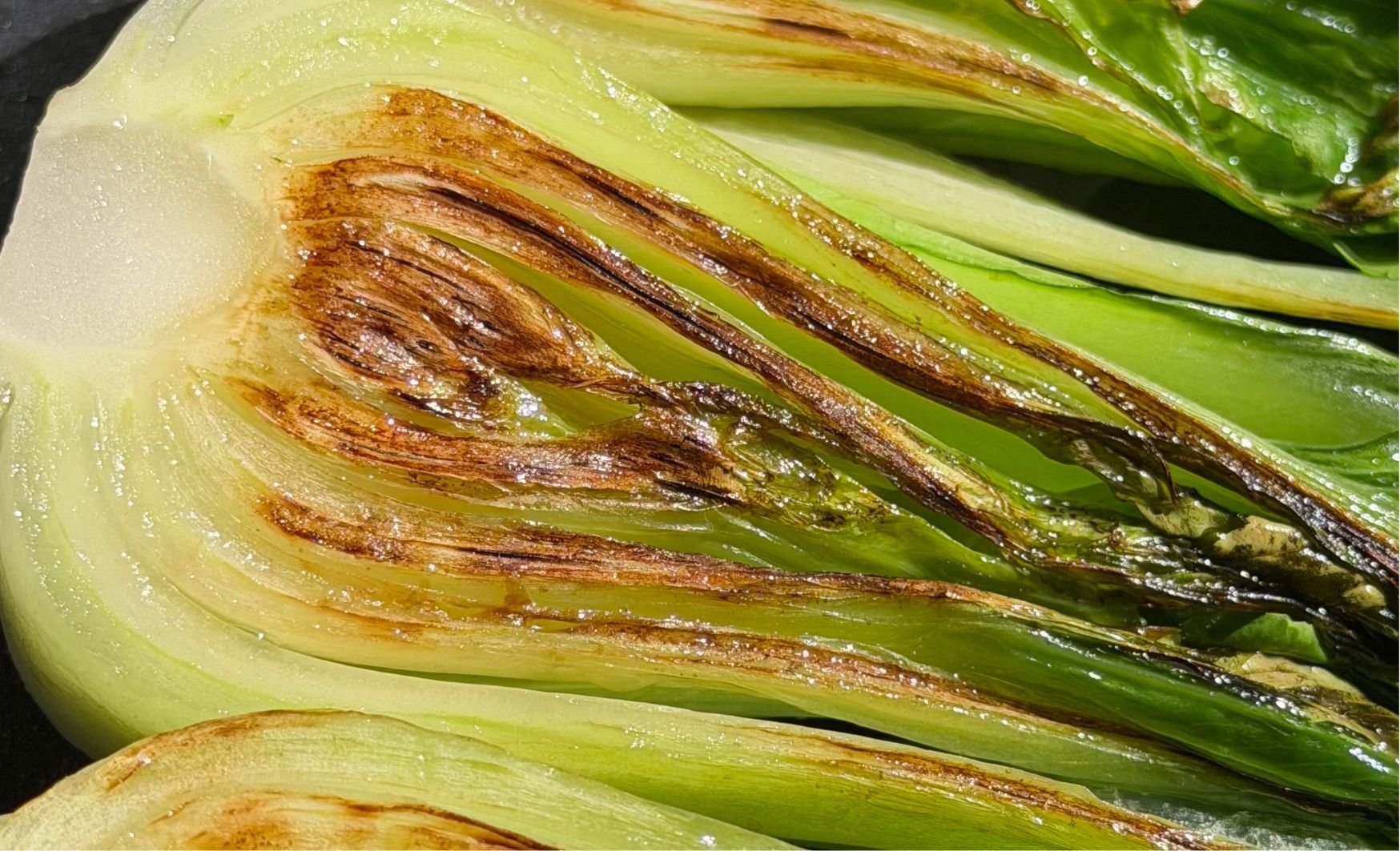 מניחים את חצאי הבוק צ׳וי עם הצד החתוך כלפי מטה, מוסיפים מעט מים ונותנים להם להיצרב כ-5 דקות עד שהם מקבלים חריכה יפה ורכה.
